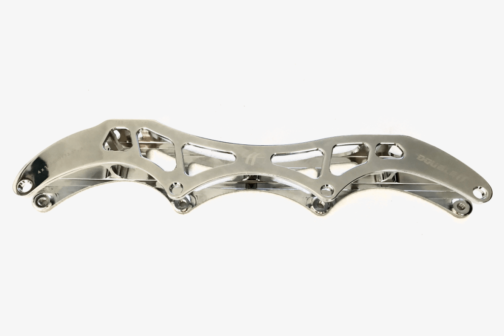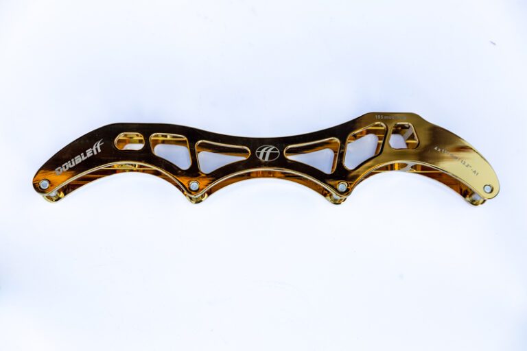 The way in which the Aluminum “W”-extrusion is manufactured and the Aluminum grade in combination with the milling treatment guarantees the needed stability and stiffness and at the same time sufficient flexibility for steering during skating. We call it “stiff flex”! This unique combination is reached due to feedback on the proto types of the frames of out inline team skaters participating international championships. The “stiff flex” off our frames is the main reason why skaters prefer our frames. As well the silver as gold surface coating offers next to the shiny look also extra protection. The unique four-step coating process offers a sustainable but also nice and shiny look!